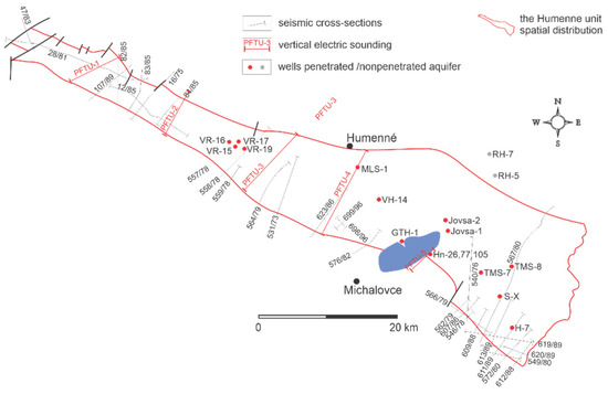 Spatial distribution of geophysical methods, boreholes and the shape of the Humenné Unit.