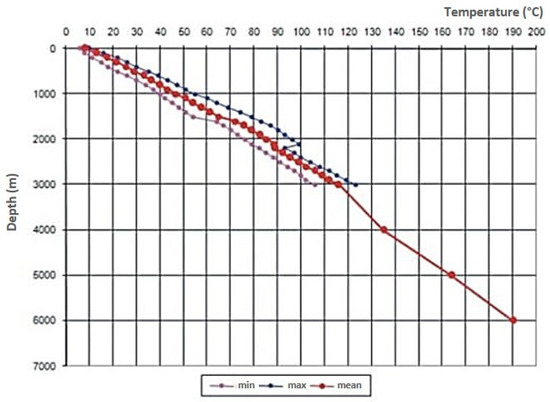 The heat flow of the Humenné Unit ranges from 75 to 85 mW·m−2 in the northwestern part of the territory and reaches up to 95 mW·m−2 in the southeastern part. The temperature field reflects the cooling effect of the elevation of the Humenské Mountains. At a depth of 1000 m, the Humenské Mountains are surrounded by a 40 °C isotherm. With the decreasing influence of the mountain uplift, the temperature rises on all sides up to 45 °C, and up to 50–55 °C toward the southeast. At a depth of 2000 m, temperatures range from 70 to 95 °C [21]. The average temperature gradient in the interval of 0 to 1000 m is about 39 K/km. For a depth interval of 1000–2000 m, it is about 36 K/km. For a depth of 2000–3000 m, the average temperature gradient is 33.8 K/km with an average temperature at a depth of 3000 m of approximately 117 °C [22].