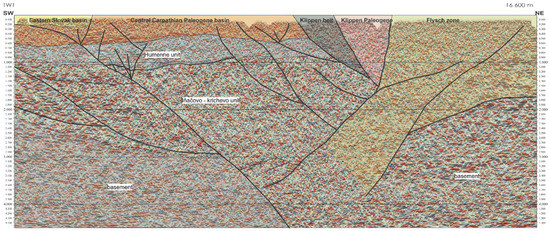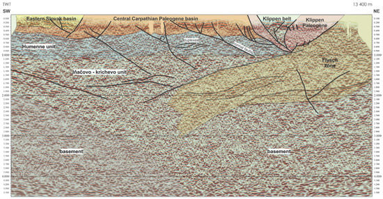 The lower boundary between the Humenné Unit and the Inačovo–Kričevo Unit basement is not clear. The Humenné Unit is overthrusted over the Inačovo–Kričevo Unit (borehole MLS-1). Due to lithological similarities, it is difficult to distinguish between the two units. The lowest unit (Inačovo–Kričevo Unit) is characterized by alternating parallel reflexes with low lateral endurance and low-reflex areas [32,33]. The deepest unit is an unspecific basement marked by inclined reflexes.