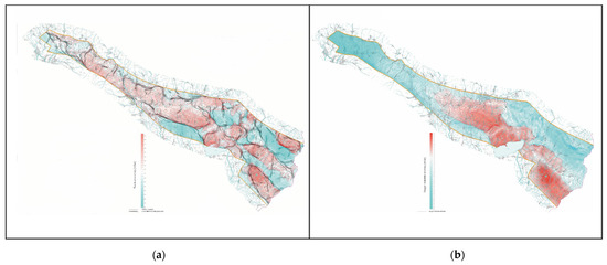 The gravimetric interpretation took place in two stages. In the first stage, a map of complete Bouguer anomalies was compiled, which was the basis for qualitative and quantitative gravimetric interpretation. Maps were compiled for two reduction densities of 2.20 g·cm−3 and 2.67 g·cm−3 [34]. A map for a density of 2.67 g·cm−3 was used for the interpretation shown later in this article (Figure 7b).