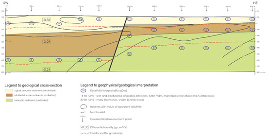 Geoelectric resistivity profile No. PFTU-5 (see Figure 3). Lower differential density between Miocene and Cretaceous sediments does not allow clearly divided sedimentary boundaries. With increasing depths (more than 500 m), the quality of interpretation decreases (modified after [24,37]).