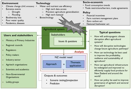 Flow chart from disruption of NZ agricultural system, modelling need, to solution design. Surrounding in red, where an analysis and synthesis of knowledge is proposed.
