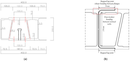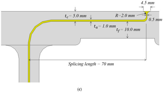 Configuration of section and adhesive layer in TG200 bridge deck. (a) Section dimensions; (b) stepped lap joint; (c) dimensions of adhesive layer.