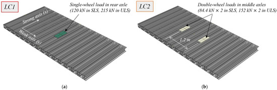 As shown in Figure 3, and according to the Korean Highway Bridge Design Code [14], two loading configurations are considered: (1) the force effect due to a single rear wheel (LC1 hereafter) and (2) the force effect due to two adjacent middle wheels (LC2 hereafter). The LC1 wheel load (120 kN) is distributed over the tire contact area (231 mm long and 577 mm wide) at the top surface of the deck. The two adjacent loads (84.4 kN each) in LC2 are distributed over the tire contact area (each 217 mm long and 540 mm wide) 1.2 m apart, as shown in Figure 2 and Figure 3.