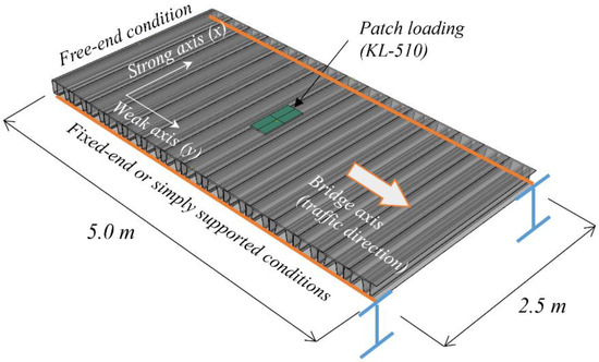 The adhesively connected GFRP bridge deck is supported by steel plate girders under design wheel loads distributed over the tire contact area (indicated by a green rectangle), as shown in Figure 4. The FE model is considered a one-way slab with a 2.5 m span length between the plate girders. To sufficiently represent the weak-axis bending behavior, the length of the deck FE model in the weak axis is selected as 5.0 m, which is twice the span length of the strong axis.