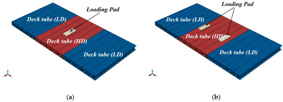 The pultruded GFRP deck tubes and adhesive joints between them are modeled using Element C3D8R (linear bricks of eight nodes with reduced integration) in ABAQUS [18]. As shown in Figure 5a,b, the FE models have four parts: (1) a deck tube discretized with high-density (HD) solid elements (red), (2) a deck tube discretized with low-density (LD) solid elements (blue), (3) an adhesive joint between the deck tubes (black lines between deck tubes), and (4) loading pads for the wheel loads (gray). High-density solid elements are used at the adhesive joints and loading pads to simulate local behaviors. Figure 6a shows the top (blue), bottom (red), and web plates (gray), the adhesive joints (blue line), and the loading pad (gray at top) in section.