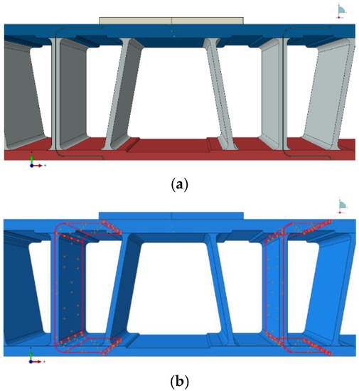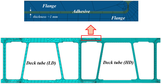 In our previous weak-axis bending tests [11], failure was observed in the adhesive material but none at the bonding surface between the deck tubes and adhesive. Thus, the bonding between the deck tubes and adhesive is simulated by tie elements (Figure 6b) in ABAQUS, assuming complete bonding. However, to consider failures at the bonding surface between deck tubes and adhesive, nonlinear tie elements or contact elements should be used based on the corresponding test results.