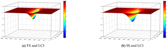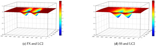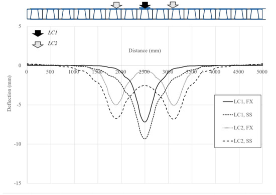 The global deflections are evaluated to investigate the serviceability of the deck under the service loads. Figure 8a,b shows the deformed shapes of the bottom plate in the deck under FX and SS, respectively, and LC1. Figure 8c,d shows the deformed shapes of the bottom plate in the deck under FX and SS, respectively, and LC2. The maximum deflection is larger in LC1 than in LC2; thus, LC1 governs the deflection requirements in SLS. Figure 9 and Figure 10 compare the deck deflections along the weak and strong axes, respectively. Notably, the deflected region is much narrower in the weak axis than in the strong axis because the flexural stiffness is much lower in the weak axis.