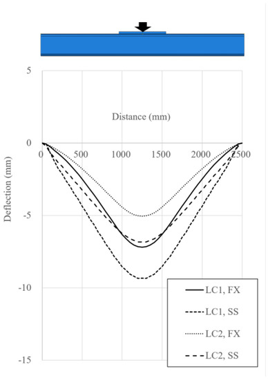 Table 11 summarizes the maximum deck deflections. They are 7.19 mm and 9.34 mm under FX and SS and LC1, which can be represented as L/348 and L/268, respectively, for the 2500 mm span. The maximum deflections of the deck under LC2 are 5.08 mm and 6.84 mm in the FX and SS, which can be represented by L/492 and L/366, respectively. The deck under LC1 deflects more than that under LC2. Because the double-wheel loads are sufficiently separated, the deformations of the two adjacent wheel loads do not interfere during weak-axis bending. Thus, none of these GFRP decks satisfies the serviceability deflection limit for vehicular bridges (L/800) shown in Table 2. Therefore, it is necessary to increase the flexural stiffness or decrease the span in strong axis.