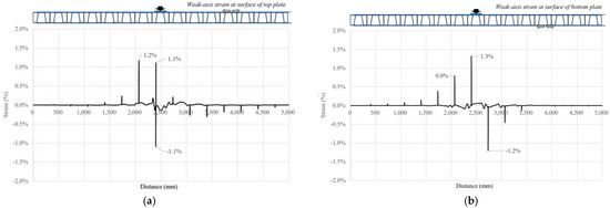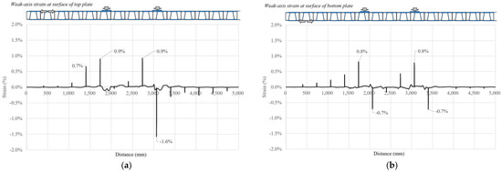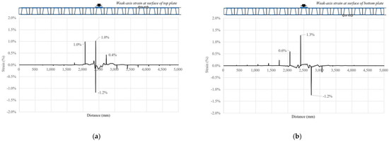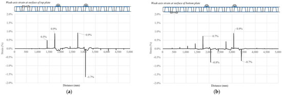 As shown in Figure 11, Figure 12, Figure 13 and Figure 14, the weak-axis tensile strains along the bottom and the top surfaces of the deck highly concentrate at the adhesives near the loading area, as described by Park et al. [11]. This is caused by the local deformation of the deck section and relatively low stiffness of the adhesive. The highly concentrated tensile strains at the adhesive cause adhesive tensile failures and reflective cracks on the asphalt pavement. To avoid these problems, it is necessary to reduce the strain in the adhesive by selecting adhesives with higher stiffnesses or optimizing the joint configuration.