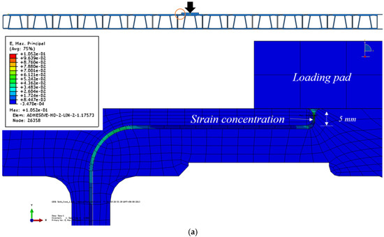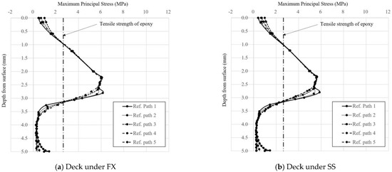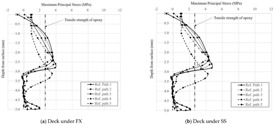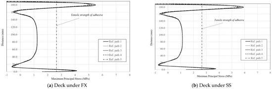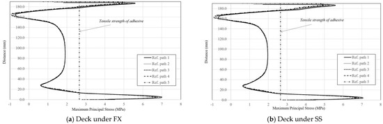 Figure 15a shows the contours of the principal strains near the loading area of the deck under FX and LC1 in SLS. Five reference paths are defined in Figure 15b, and each path has the node sets in the adhesive element. The principal stress distributions in the adhesive along these paths are investigated to determine the change in the distribution. Figure 16 and Figure 17 show the principal stress distributions along the reference paths under LC1 and LC2, respectively, in SLS. The maximum principal stresses occurr at the necking area 2.6 mm from the deck surface under LC1 and 2.8 mm under LC2. Because the stresses at these locations exceed the design tensile strength, 2.65 MPa (tested tensile strength 6.2 MPa/partial safety factor 2.34), the adhesive material undergoes tensile failure, even in SLS. Table 13 summarizes the maximum principal stresses along each reference path. Notably, even in SLS, the calculated maximum principal stresses in the epoxy adhesive exceed the design tensile strength of 2.65 MPa, resulting in a factor of safety below 0.65. For ULS, the factor of safety is below 0.38. To avoid this failure in the adhesive, it is necessary to change the shape of the lap joint to reduce the tensile stress in the adhesive.