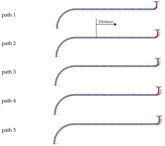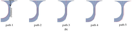 TG200 bridge decks typically have stepped lap joints at the bottom and top plates that connect the deck tubes (Figure 1a). In this joint configuration, the strain and stress of adhesive between flanges tend to concentrate at the edges [22,23,24,25,26]. The stresses along the five reference paths in the adhesive layer shown in Figure 20 are calculated, and safety against SAF is checked.
