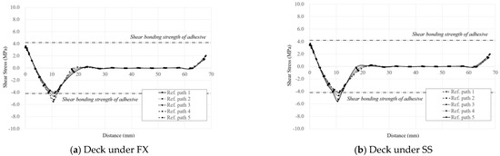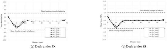 Figure 21 and Figure 22 show the shear stress distributions along the reference paths under LC1 and LC2, respectively, in ULS. The distributions of the shear stress are almost the same, regardless of the boundary conditions under the same load configuration. Table 14 summarizes the maximum shear stresses of the adhesive layer along the reference paths between bonded flanges. For the deck in ULS and LC1, the maximum shear stresses in the adhesive are 5.53 MPa and 5.58 MPa under FX and SS, respectively, which exceed the 4.19 MPa design shear strength of the adhesive (shear strength 9.8 MPa/partial safety factor 2.34). To prevent this failure, it is necessary to reduce the shear stress by modifying the bonding configuration or selecting adhesives with higher shear strength.