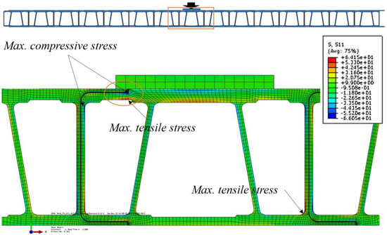 The tensile and compressive stress in the deck substrate are calculated to check for safety against FSD. Figure 23 shows the contours of the compressive and tensile stresses of the deck substrate near the loading area under LC1 and FX in ULS. The stresses concentrate where dimensions change discontinuously in the section, such as in the stepped lap joint in the flange and the corner between the flange and the web. Table 15 and Table 16 summarize the maximum values of these compressive and tensile stresses. At the stepped lap joint in the flange, the maximum compressive and tensile stresses slightly exceed the design strength of the deck substrate in ULS (bold numbers in Table 15). At the corner between the flange and the web, the maximum compressive and tensile stresses are considerably greater than the design strength of the deck substrate in ULS (bold numbers in Table 16). The design strengths of the flange and web are determined, as shown in Table 10, based on the test strengths [1,3] and the partial safety factor (Table 5). The minimum of the design strengths for the flange and the web is taken as the corner design strength. To prevent this failure, more fibers should be provided at these locations to increase the compressive and tensile design strengths.