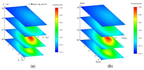A space of 4 m × 4 m × 4 m is constructed as a 3D temperature field reconstruction area. Set three different 3D temperature distribution numerical models as the research objects of the temperature reconstruction in this section, which are used to calculate the prior dataset and the test dataset. Apply the proposed 3D temperature distribution reconstruction algorithm to reconstruct the temperature profile under different test conditions. The effectiveness and feasibility of the reconstruction algorithm are analyzed. Restricted by the existing calculation conditions, the three-dimensional temperature distribution data is characterized by selecting 2D temperature field sections at different heights (0.5 m, 1.5 m, 2.5 m and 3.5 m).
