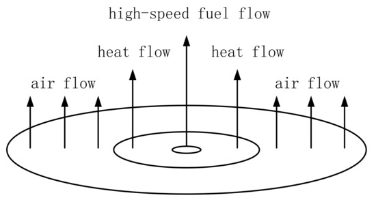The geometric dimensions of the burner outlet are as follows: the diameter of the fuel outlet is d = 7.2 mm; the diameter of the wake heat flow outlet is 18.2 mm, which is an annular structure; the outside of the heat flow outlet is air flow. In order to facilitate the establishment of the model in the subsequent process, the diameter d of the fuel outlet is used as the unit length to characterize the size and coordinate position [33].