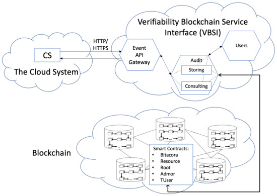 Figure 1 illustrates an outline of our model. The Cloud System, denoted as , is illustrated in the left part of Figure 1. CS must establish communication with The Verifiability Blockchain Service Interface, abbreviated as VBSI, for both to store each event that occurs internally within and to provide reliability by means of a consulting process. VBSI is an intermediary between CS and the blockchain part. Blockchain acts as a software connector [37], where all events are registered. The following subsections outline the general operability of these three parts: , VBSI and the blockchain.