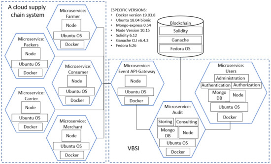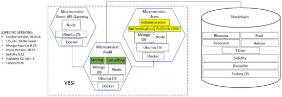 Figure 1 illustrates three general microservices: Event API-Gateway, Audit and Users, as illustrated at the top-right of Figure 1. VBSI is the interface of our model, dedicated to interacting with The Cloud System. sends HTTP (respectively HTTPS) request methods to trigger events. These events are received by the Event API-Gateway, which assorts the events and resends to one of the following types of services: (a) Storing data (it involves submitting, updating, or deleting information) in a hashed way; or (b) Consulting information for audit issues. Any of these services must check the suited permissions with the Users service. The answer sent to The Cloud System depends on the processed operation in the blockchain. Details of the global mechanism of VBSI will be explained in Section 4.