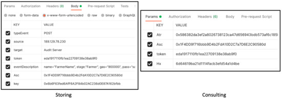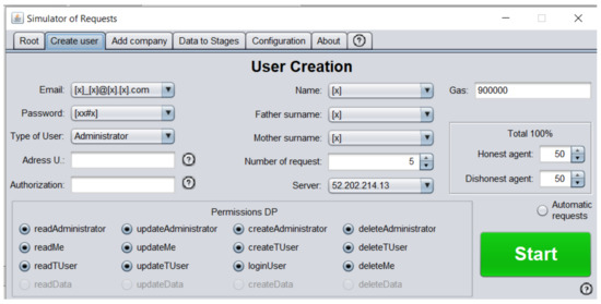 Let be credentials related with personal information of the user to be created, such as username, email, and a hashed password; be the type of user to be created; be the public key of the user; is the value required to execute the transaction in the blockchain; be a set of permissions that the user will be granted expressed in JSON format (Section 4.4.3 explains more about the permissions); and be the hashed of the previous messages. When a user is created, it also requires to create its smart contract, calling a storing operation (see Section 4.2), receiving and it is returned also.