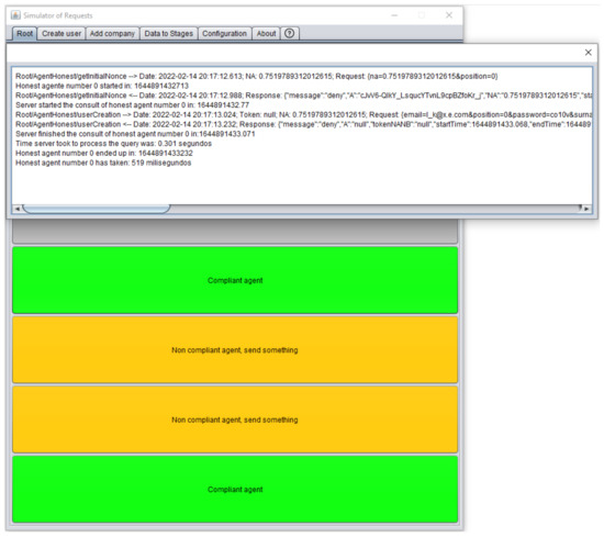 We carried out some tests with respect to the amount of resources required to run the storing and consulting services. The tests were latency and processing time. Latency is the time any supply chain microservice takes to reach its destination and return, taking into account an HTTP request. The processing time is the time in milliseconds (ms) that the API Gateway takes to execute a request since it arrives until it is processed and returned to the requester. Table 7 shows some details of one of the runs. The first column states the stage of the cloud supply chain microservice from where the request was established. The following three columns state the transaction latency (Start, End) that the request takes (Time) to reach its destination and return to the microservice. The fifth column pinpoints the HTTP method executed (POST, PUT, DELETE, or GET). The next three columns state the processing time within the Event API-Server. The last column is a brief description about the type of request. Note that Start and End columns are expressed in epoch Linux time, and column Time is expressed in milliseconds, being it the difference between End and Start.