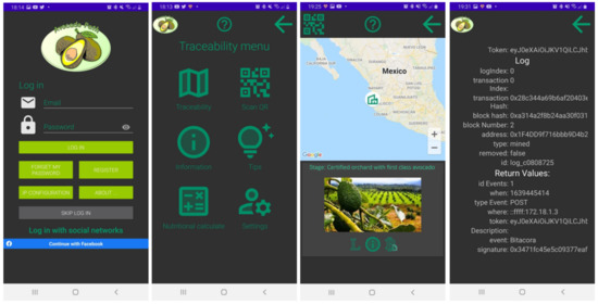 Figure 13 shows the outstanding interfaces from a mobile application we developed to verify the integrity of data previously stored within a blockchain. The figure contains four images, from left to right: (1) Login interface: where the user might sign in by a previous register or by social networks; (2) A menu option with the possibility to scan QR codes to see the traceability of the avocado supply chain that the user wants to buy; (3) The traceability interface with a specific location in Google maps, and options such as stage details forward and backward arrow navigation, among others; and (4) The evidence log taken from the blockchain illustrates the interface that the final user can see to verify the details stored in the blockchain, otherwise, such details would not be shown.