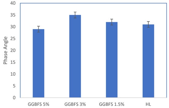 The dynamic modulus (E*) and phase angle were derived from AMPT testing in accordance with AASHTO [28] (Figure 9). The phase angle of Mixture 2 (3% GGBFS) was the highest at 35, followed by 32 for the 1.5% GGBFS mix. The phase angle of the mixture with 5% GGBFS was 29, which is lower than those of the 3% and 1.5% GGBFS mixtures. This is consistent with the results indicating better fatigue and rutting performance in the 3% GGBFS mixture. Figure 10 shows a sample of AMPT test results. A higher phase angle supports the idea of the mixture being more elastic. Master curve construction is based on the fact that the dynamic modulus presents an S-shaped format. The tests were conducted in different reduced frequencies. Figure 11 presents the results at 20 °C. Figure 11 presents master curves for the tested specimens, which are plotted as E* versus reduced frequency. The curves show that Mixture 2 (3% GGBFS) had the best performance, showing that the majority of 3% GGBFS tests presented a higher E*.