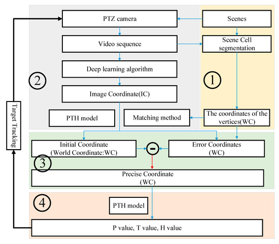 The proposed method mainly includes four parts. Firstly, the scene is divided into multiple cells that were calibrated; secondly, YOLOv4 is used to detect the image coordinates of the target and the cells’ vertices. Then, the cells’ vertices in the image are matched by the proposed matching method; thirdly, the precise world coordinates of the target are calculated by the proposed method; finally, the world coordinates are transformed into angles of the PTZ camera, to track and observe the target. The overall flow chart of the system is shown in Figure 1. The specific method is to change the P value and T value of the PTZ camera continuously to ensure that the moving target is always in the center of the FOV (field of view).