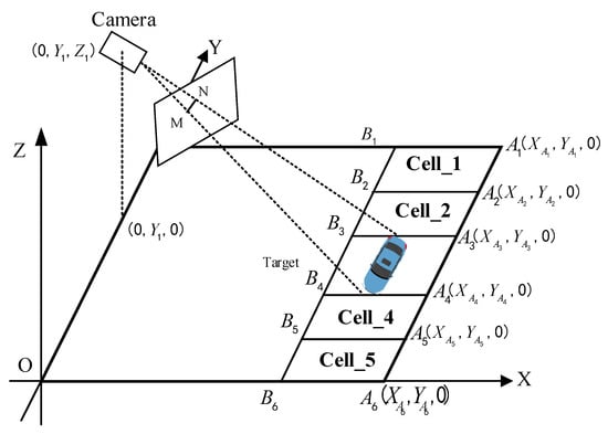 In a wide traffic scene, it is often impossible to observe the dynamics of the entire scene through a fixed-view camera. In contrast, a PTZ camera obtains information about targets in a wider scene by adjusting the camera’s observation parameters. Furthermore, observing the target in real time with an active camera is an effective method for obtaining the target’s motion information state. The purpose of this paper is to propose an approach based on the scene’s cell division for precisely positioning the target and tracking and observing it in real time using the active camera. As shown in Figure 2, suppose the camera is on the ZOY plane in the world coordinate system, and the target is on the XOY plane. The target area is partitioned into continuous cell areas using predefined rules, and each cell area’s vertices are calibrated.