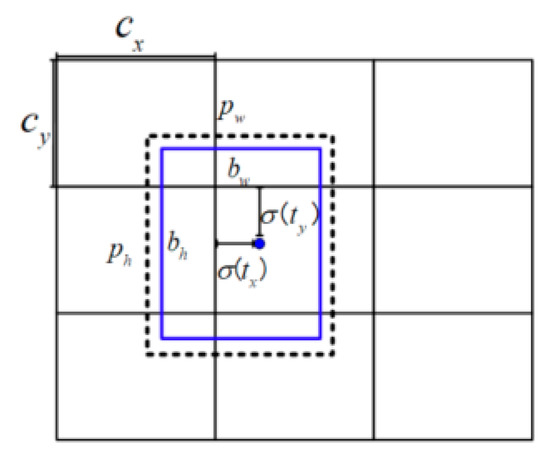 The prediction method of the YOLO series algorithm is shown in Figure 3. The recognition result of YOLOv4 is shown in Figure 4. The neural network predicts five bounding boxes on each unit of the feature map, and each bounding box indicates five values, which are . The first four values are coordinates and is the confidence level. The length and width of the bounding box corresponding to the cell are , respectively. The distance between the cell and the upper left corner of the image is . Then, the predicted value is