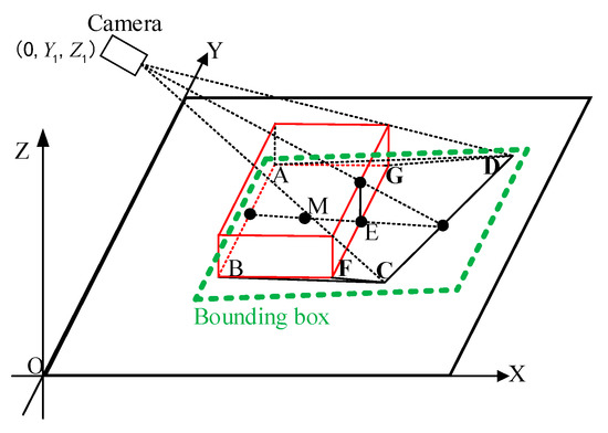 As shown in Figure 7, in the camera’s perspective, the image of the red target on the XOY plane is ABCD, but in actual situations, the projection of the target on the XOY plane is ABFG. As a result, the quadrilateral ABCD and the quadrilateral ABFG are quite different. When the YOLOv4 algorithm is used to identify the target, the bounding box of the identified target is shown in Figure 7. The center point of the green bounding box representing the target position deviates further from the target’s true position. Therefore, this paper proposes a position compensation method. The error value of the target at that point is subtracted to obtain the precise position of the target. The specific method is shown in Figure 8.