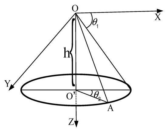 As shown in Figure 9, the PTZ camera is regarded as a point, and the PTZ camera is located at point O. Set point O as the origin of the world coordinate system, and the coordinates of point A are . The ellipse in Figure 9 is on the ground in the real scene, and the vertices of the cell and the WRC-Jeep in the scene are regarded as points on the ground. According to the coordinate characteristics, it is easy to derive the following formula: