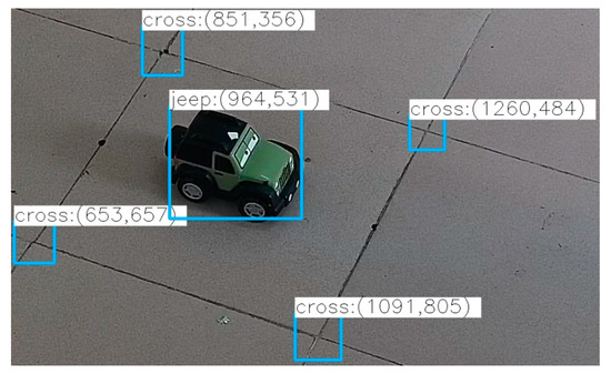 The size of the image is 1920 (pixel) ∗ 1080 (pixel), so the coordinates of the image’s principal point are (963, 557). YOLOv4 detected the coordinates of each vertex (Figure 12). Then, the cell where the image principal point is located in the world coordinate system can be calculated by using the proposed cell recognition method. Then, the world coordinates and error coordinates of each vertex of the cell where the image principal point is located can be determined (Table 2 or Table 3). The homography matrix can be obtained according to the PnP algorithm. Then, the initial world and error coordinates of the WRC-Jeep can be obtained according to the image coordinates of the WRC-Jeep. The fourth column of Table 4 is the initial world coordinates of the WRC-Jeep, and the fourth column of Table 5 shows the error coordinates of the WRC-Jeep; the accurate world coordinates of the target can be solved.