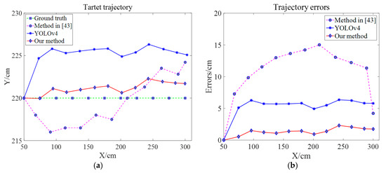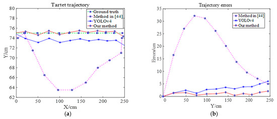 Trajectory and PTZ errors of the target on the horizontal channel. (a) Target trajectory. (b) Trajectory errors [43].