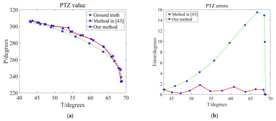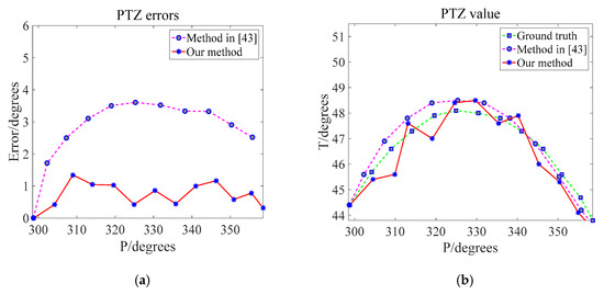 Observation angle and angle error of the PTZ camera in the horizontal channel. (a) PTZ value. (b) PTZ errors [43].