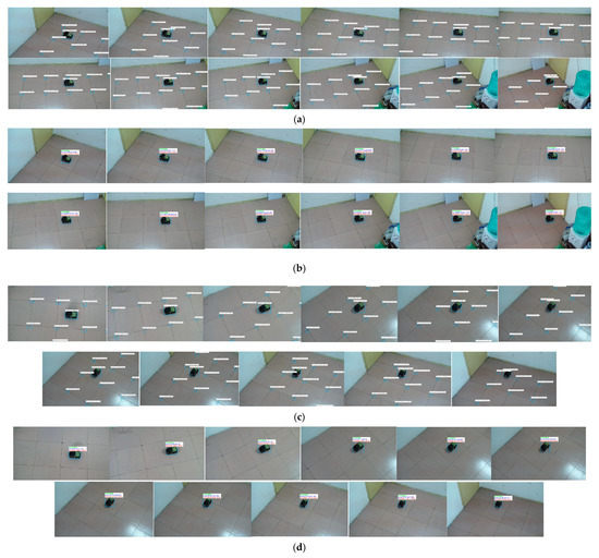 The proposed method was tested on 50 cm ∗ 250 cm horizontal and vertical channels. The experimental equipment used in the experiment is shown in Figure 10. It mainly includes a PTZ camera. This active camera is produced by Hikvision Company. Its model is DS-2DF8231IW-A, the focal length range of this camera is 6 mm to 186 mm, it has two degrees of freedom of rotation, and the pan and tilt angles are between 0~90 degrees and 0~360 degrees, as shown in Figure 10. In this experiment, the resolution of the captured image is set to 1920 × 1080 (pixels). Another experimental device used in this experiment is a wireless remote-control car, as shown in Figure 10b. The length, width and height of the car are 22.5 cm, 14 cm and 13.5 cm, respectively.