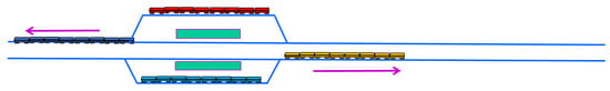 In this study, we focus on the different types of train passes on double-track lines, where they are much more common than on single-track lines. A train pass occurs when a train passes another train moving in the same direction. Two assumptions are made in this study: (1) double tracks are treated as a separate independent system in each direction, and (2) the separate systems are reserved for trains in one direction each. This implies that each track in the double track is subjected to one-way traffic, and the trains are assumed to not encounter oncoming trains or turns through oncoming trains since the trains can only move in one direction. Thus, train conflicts in the opposite directions as well as in switching areas were not taken into consideration in this study. These assumptions are illustrated in Figure 1.