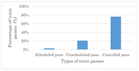 Our first finding is that, in the data we studied, passes rarely happen as scheduled. As we see in Figure 3, the most common scenario at 76% was that train passes are cancelled, followed by unscheduled passes at 21%. Scheduled passes were the least common, at 3%, and 97% of the passes did thus not occur as scheduled. This indicates that the timetable is difficult to realise with a high level of accuracy. It also suggests a high degree of activity among dispatchers to cancel and reschedule train passes, shifting them from one station to another.