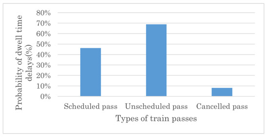 Our second finding is that these three types of train passes are associated with very different delay probabilities. As indicated in Figure 4, the probability of delay was highest, 69%, when passes are unscheduled. A cancelled pass was only associated with an 8% probability of delays, while a scheduled pass was in between these two, with a 46% probability of delay. Cancelling a pass is thus a good way to reduce the risk of delays at one station, but it can bring with it a large increase in the probability of delay at another station. For context, when there is no pass, which is the most common situation in operations, there is a 22% probability of dwell time delays—better than when there is a scheduled pass, but worse than if there is a cancelled pass.