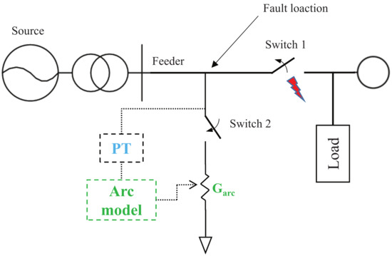 where . In addition, g is the time varying arc conductance, is the absolute value of the arc current, is a constant arc voltage, is the arc time constant. To implement Kizilcay’s arc model, the parameters, A, B, and , are set to , , and 4520, respectively.