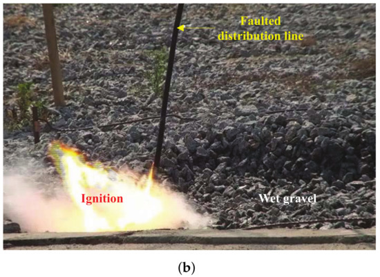 In the arc experiment, wet gravel was used as a contacted conductor after the fault to generate arc phenomenon. The phase voltage and phase current were measured at the point of fault location and were recorded from the point after the open phase. Therefore, a fault scenario was constructed as follows:
