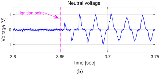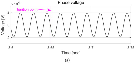 Figure 3 shows the phase voltage and neutral voltage in the fault phase and neutral line. Given that the phase voltage was supplied from the distribution system, we confirmed that there was no change in the magnitude of the phase voltage after the ignition point (at 3.65 s) because the phase voltage was continuously supplied to feeders by utility regardless of the fault. However, an unbalanced voltage was shown in Figure 3b after the ignition point in the neutral voltage due to the effect of the fault. However, since the magnitude of the neutral voltage is very small, it hardly affects the magnitude of the phase voltage.