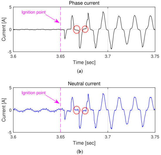 Figure 4 shows the phase current and neutral current in fault phase and neutral line. The phase current is close to zero before the ignition point because the phase was faulted by Switch 1. Conversely, distorted currents with the same frequency as the fundamental frequency (60 Hz) were observed in phase current and neutral current. Moreover, a region with current close to zero appeared at every half cycle in the phase current and neutral current (red dotted line). This is due to the change in thermal resistance caused by faults, which is a representative nonlinear characteristic of the fault in power distribution networks. We termed this region as the shoulder region that appeared in the arc wave.