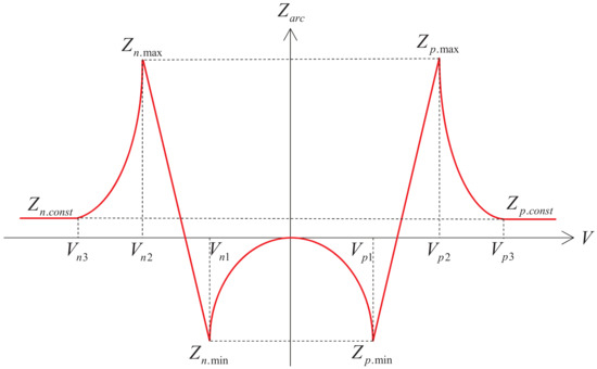 Figure 6 shows the proposed arc model, which calculates the arc impedance by using the phase voltage as the input. Since arc impedance depends on the magnitude of the phase voltage, the proposed arc model consists of the nonlinear arc impedance region , ], [, ], [, ]), linear impedance region ([ , ], [, ]), constant arc impedance region ([ , ], [, ∞]).
