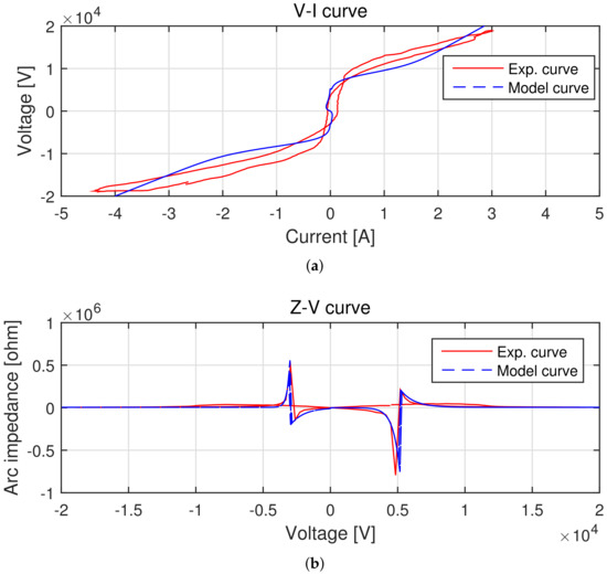 The corresponding simulated arc characteristics are illustrated in the comparison shown in Figure 7. We can observe that two V–I curves are similar and have small relative error between the experimental model and simulation model, even if the V–I curve has nonlinearity and asymmetry. The arc parameters are determined such that they match the results of V–I and Z–V curves in the arc experiment. These comparisons verify the accuracy of the arc model. As shown in the comparison results, the simulated arc model is similar to the experimental arc model. The arc parameters used in arc modeling are listed in Table 1.