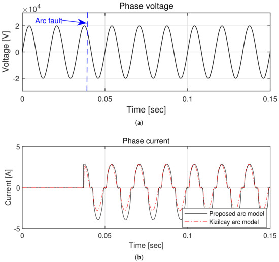 Figure 8 shows the phase voltage and phase current by using the proposed and Kizilcay’s arc model in the simulations. The phase voltages are the same in both method because phase voltages are injected from utility. Before the ignition, the phase impedance should be almost infinite in the remaining load path because there is no arc model path. Therefore, the phase current became almost zero when the phase was opened. Then, fault currents were generated after the arc fault time (0.037 [s]) in both methods. In Figure 8c, we observe that the proposed arc model had the shoulder phenomenon with nonlinearity around zero current at every half cycle because of the arc generated by (1) and (2). This nonlinearity is generated by time-varying impedances where the arc impedance is not constant. There is a buildup phenomenon with arc fault characteristics. However, because this phenomenon is not well observed due to the fast time constant in the arc experiment, it was not considered in the arc modeling procedure. Based on these results, the arc model appeared to have been accurately represented.