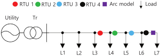 The simulations were conducted to evaluate the fault detection method developed in the study. The test system is shown in Figure 10. It models a 22.9 kV distribution feeder from the general test system of Korean Electric Power Corporation. The feeder included a 154–22.9 kV transformer that connected the utility and feeder. The fundamental frequency and sampling frequency corresponded to 60 Hz and 6 kHz, respectively. Therefore, N is set to 100. Subsequently, was defined as 1.5 to calculate excess kurtosis. Furthermore, was set to 0.4 for fault detection. Four RTUs were used to obtain phase currents and kurtosis indexes at different locations. In general, electric arcs were generated after a certain amount of time elapsed after the phase opening. Thus, in the simulation, a fault scenario was constructed in which the fault occurred 1 s after the simulation commenced and then load switching was produced for of the system load at 1.3 s, finally the fault arc occurred after 1.5 s.