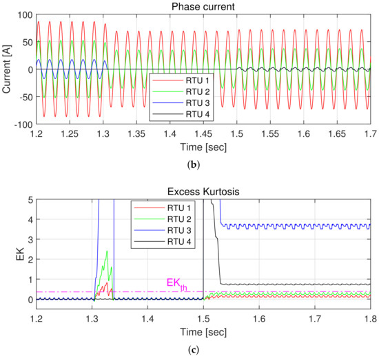 Figure 11 shows phase currents and excess kurtosis indices. As shown in Figure 11a, the magnitude of the phase current decreases as the distance from an overhead feeder of power system increases. We observe that the phase current at RTU 4 is nearly zero after 1 s, as shown in Figure 11b because of the infinite load impedance value when the fault occurs immediately behind RTU 4 as shown in Figure 10. Conversely, although the phase currents were reduced in other RTUs, it was confirmed that the phase currents did not correspond to 0. This is due to the fact that the load impedances at each RTU exhibited finite values although the load impedances changed. After 1.5 s, the shoulder phenomenon, which is a typical fault with arc, was observed in RTU 4. After 1.3 s, the phase current at RTU 3 is nearly zero because the load switching was produced for . Figure 11c shows excess kurtosis indices. After 1.5 s, the change in excess kurtosis index was observed when the arc occurred, and it was observed that the distances from the fault point to the RTU were inversely proportional to the values of the excess kurtosis index. Since the load switching was produced, variation of EK value was briefly observed during 0.05 s after 1.3 s. Additionally, EK was set to 0.4 for fault detection as a threshold value of excess kurtosis index.
