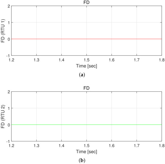 Figure 12 shows fault detection performance at each RTU. Faults were detected in RTU 3 and RTU 4, which were relatively close to the fault location. However, they were not detected in RTU 1 and RTU 2. Even if it can be seen that the EK is not zero by an effect on the load switching from 1.3 s to 1.35 s, ED values calculated from all RTUs are continuously zero before the arc ignition due to inconsistency of the EK value.