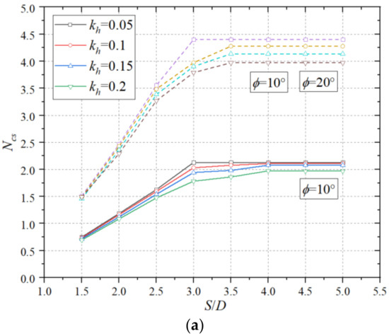 The interaction of tunnels significantly affects their stability. The estimation of critical interaction distance is the essential question in engineering practice. Figure 5 shows the effect of horizontal distance between tunnels with different influential factors. It can be determined that, for all cases, the seismic bearing capacity increases with the increase in S/D until the Ncs reaches an extremum value. This is because the further the distance between dual tunnels is, the weaker the interaction between the tunnels becomes. Additionally, the extremum value is the critical interaction distance mentioned above, beyond which the dual tunnels would not impact each other. It can be observed that the critical interaction distance of cases with a greater seismic coefficient kh is greater. This demonstrates that the seismic action would intensify the interaction between dual tunnels. Additionally, the stronger the seismic action is, the greater the interaction becomes. Through comparisons between Figure 5a,b, it can be observed that the seismic bearing capacity of cases with a deeper tunnel depth is greater than those cases with a shallower tunnel depth. Furthermore, the critical interaction distance of H/D = 1 ranges from 3 to 4, whereas the critical interaction distance of H/D = 3 ranges from 7 to 14. Namely, the deeper the tunnels are located, the greater the critical interaction distance of the tunnels becomes. It can be seen that the seismic bearing capacities of Figure 5c are greater than those of Figure 5a, which corresponds to Figure 4. Regarding the effect of φ on the critical interaction distance, it can be observed that, in cases of small seismic action (kh = 0.05, 0.1), the critical distance of different φ is almost maintained as equal, whereas if the seismic action becomes larger (kh = 0.15, 0.2), the critical interaction distance between tunnels would increase with a decreasing φ. In Figure 5b, for instance, the critical distance with kh = 0.1 is 7.5 for φ = 10° and 20°. As for cases of kh = 0.2, the critical distance with φ = 10° is 14, while the critical distance with φ = 20° is 11. Moreover, the increase in φ would lead to a greater bearing capacity, and the greater the value of φ is, the steeper the gradient of variation curve becomes. Furthermore, it can be seen from Figure 5 that the curves of φ = 10° locate closer than the curves of φ = 20°, which means that seismic action exerts less effect on cases of smaller internal friction angles.
