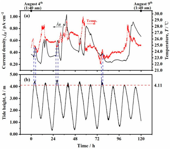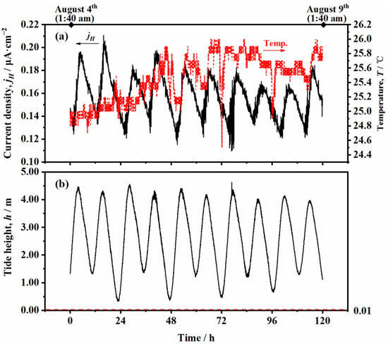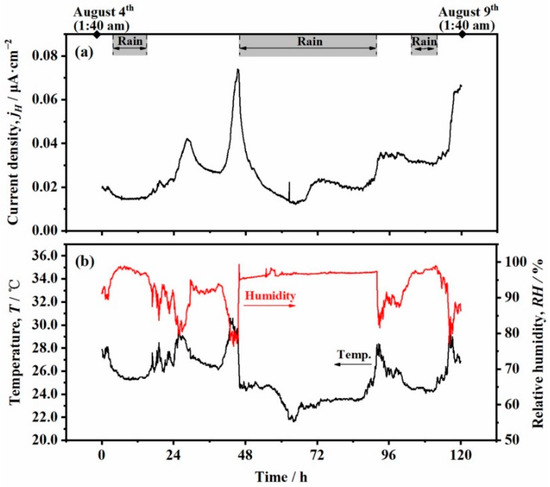 - It was found that the hydrogen permeation current density is positively correlated with the corrosion rate of the steel in the marine environment. A large hydrogen permeation current of the steel exposed to the immersion zone was observed during the outdoor test, which is considered to be related to the formation of FeS in the corrosion products caused by SRB.